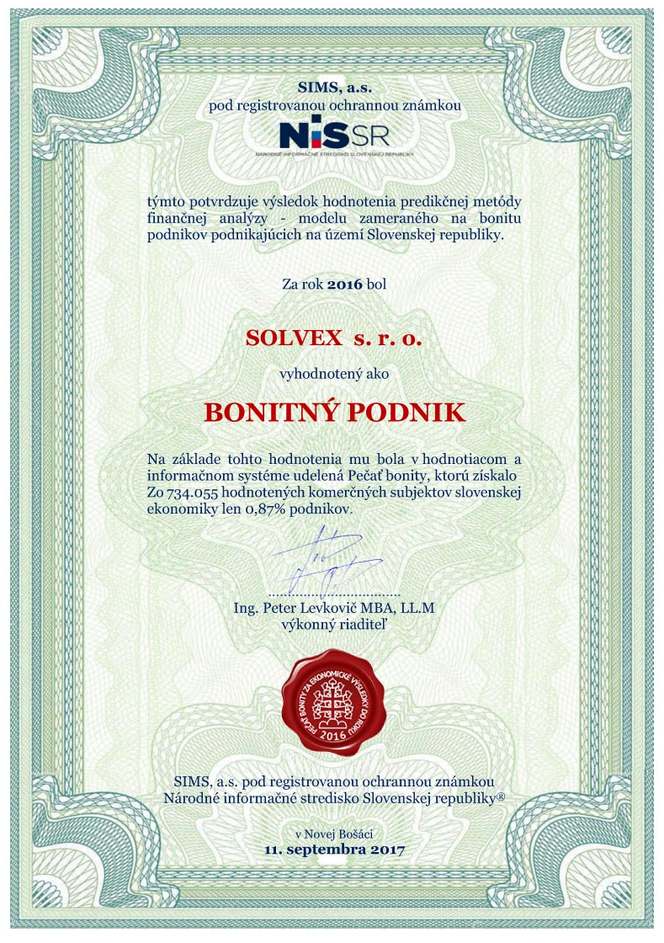 Certifikát Bonity za rok 2016